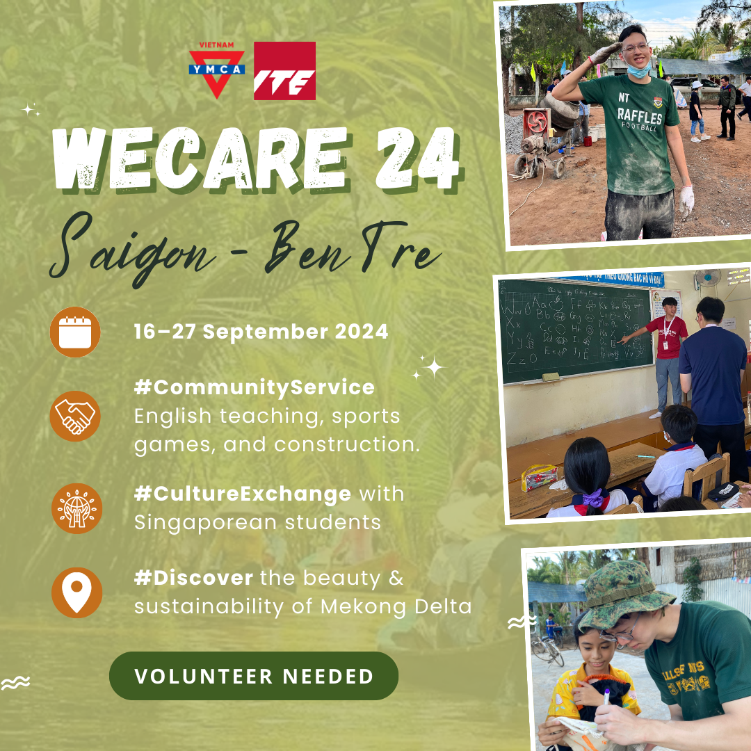 🔥WECARE 24 is looking for Vietnamese volunteers to join a community service and cultural exchange program in Ben Tre Province. Partnering with the Institute of Technical Education (ITE) Singapore, we’ll work together to support Phuoc Ngai Primary School, an underserved community. Volunteers will engage in English teaching activities and infrastructure development while fostering cross-cultural learning and connections with Singaporean students.